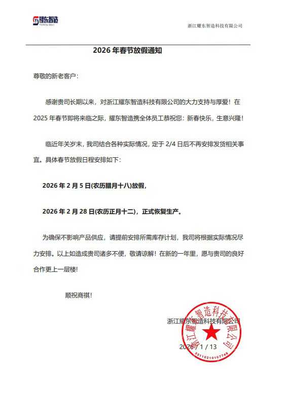 (Zhejiang, [date actuelle]) À l'approche du Nouvel An lunaire, diverses industries ont commencé leur période de révision et de repos annuelle. Aujourd'hui, Zhejiang Yaodong Smart Manufacturing Technology Co., Ltd. a officiellement publié son calendrier opérationnel pour la Fête du Printemps, marquant la conclusion réussie de ses efforts de production et de livraison pour 2025 et le début du sprint final avant les vacances.